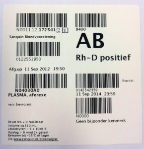 Compared to the structure of the labels that Sanquin Blood Bank uses for short-life blood products, there are therefore a few differences, both in the layout and in the content of the bar codes. It is important that the software is designed for this, both for your laboratory system and product scanners.